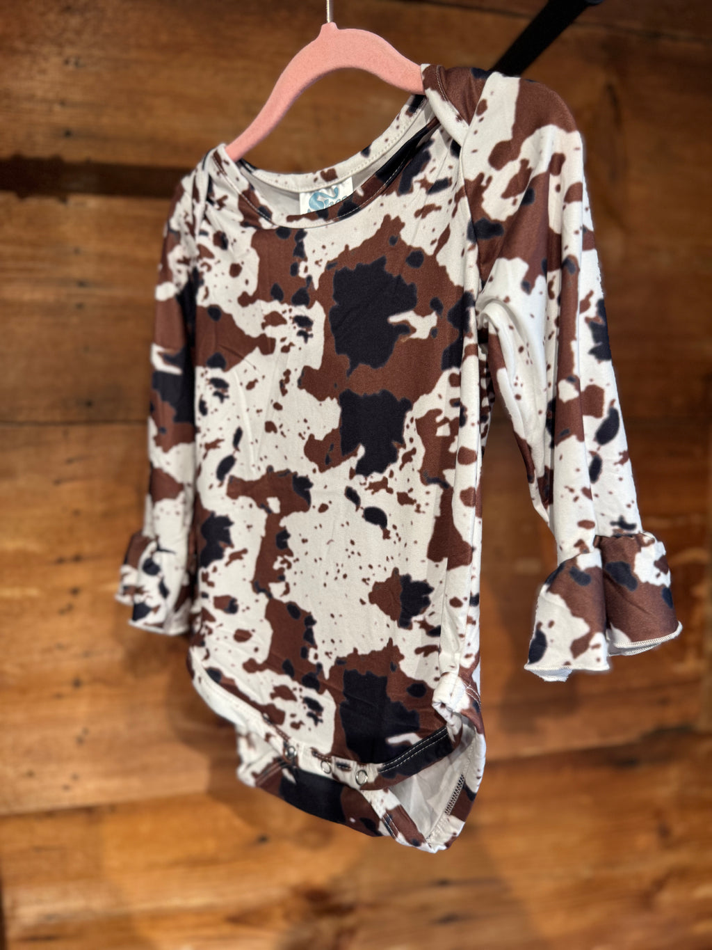 Girls: Brown Cow Print Bell Sleeve Onesie