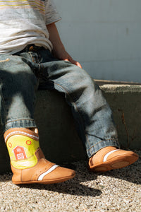 Our Farm Baby Boots offer a fun farm theme embroidered on the softest leather making it comfortable for farmers of all sizes. They display a brown stitched tractor, red barn and even a cow! This boot is every little farmer’s dream!