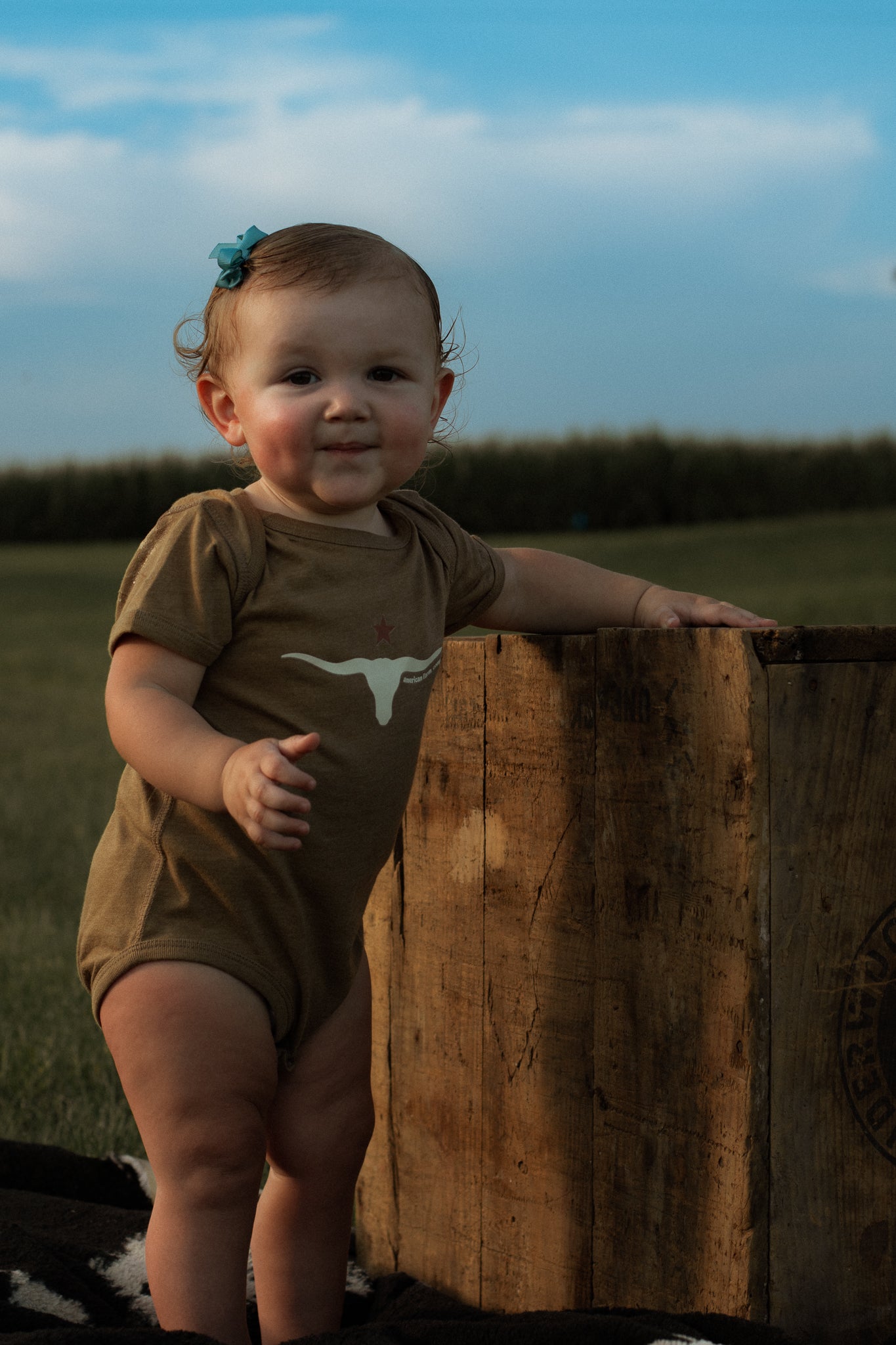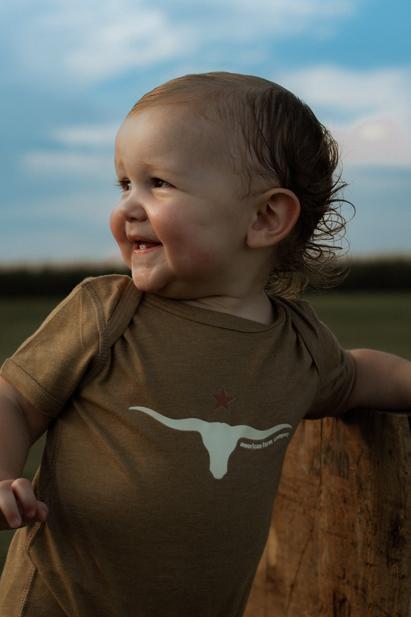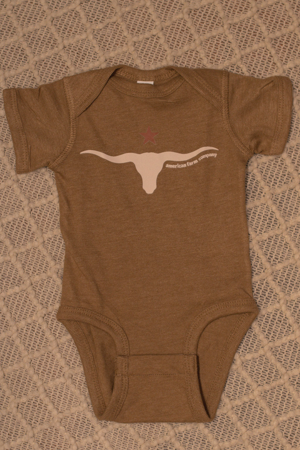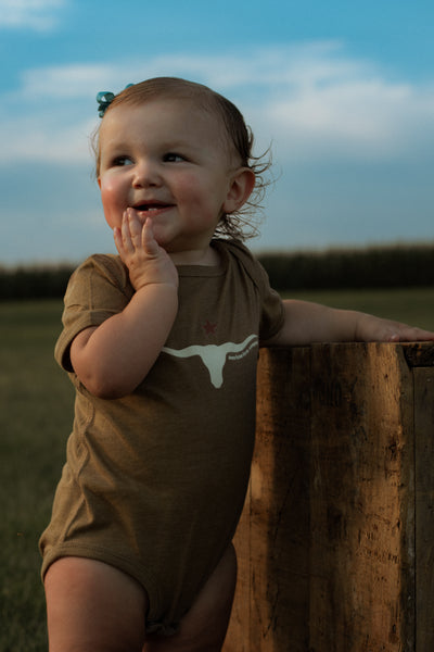 Show off your little one's wild side with our Western Skull 'Support Farmers' Heather Brown Onesie! Made from Rabbit Skin Brand 100% combed ring-spun cotton, this onesie is not only soft and comfortable, but also comes from our favorite brand: American Farm Company. Plus, the innovative three-snap closure makes dressing a breeze. Comes in sizes newborn-18 months.